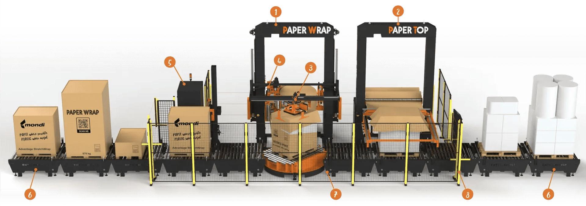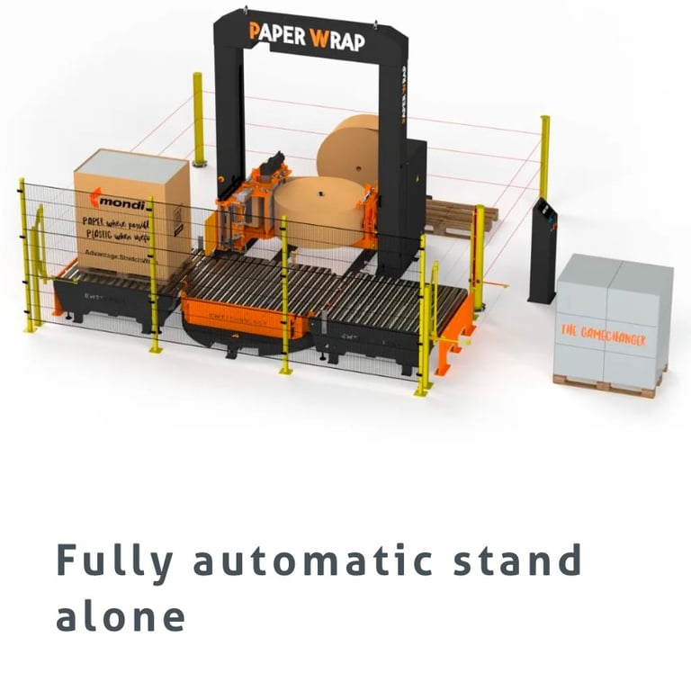 PaperWrap es una solución de enfardado automatizado de palets que utiliza papel kraft en lugar del film plástico tradicional, permitiendo a las empresas de producción y logística reducir plásticos de un solo uso y disminuir su huella de CO₂.